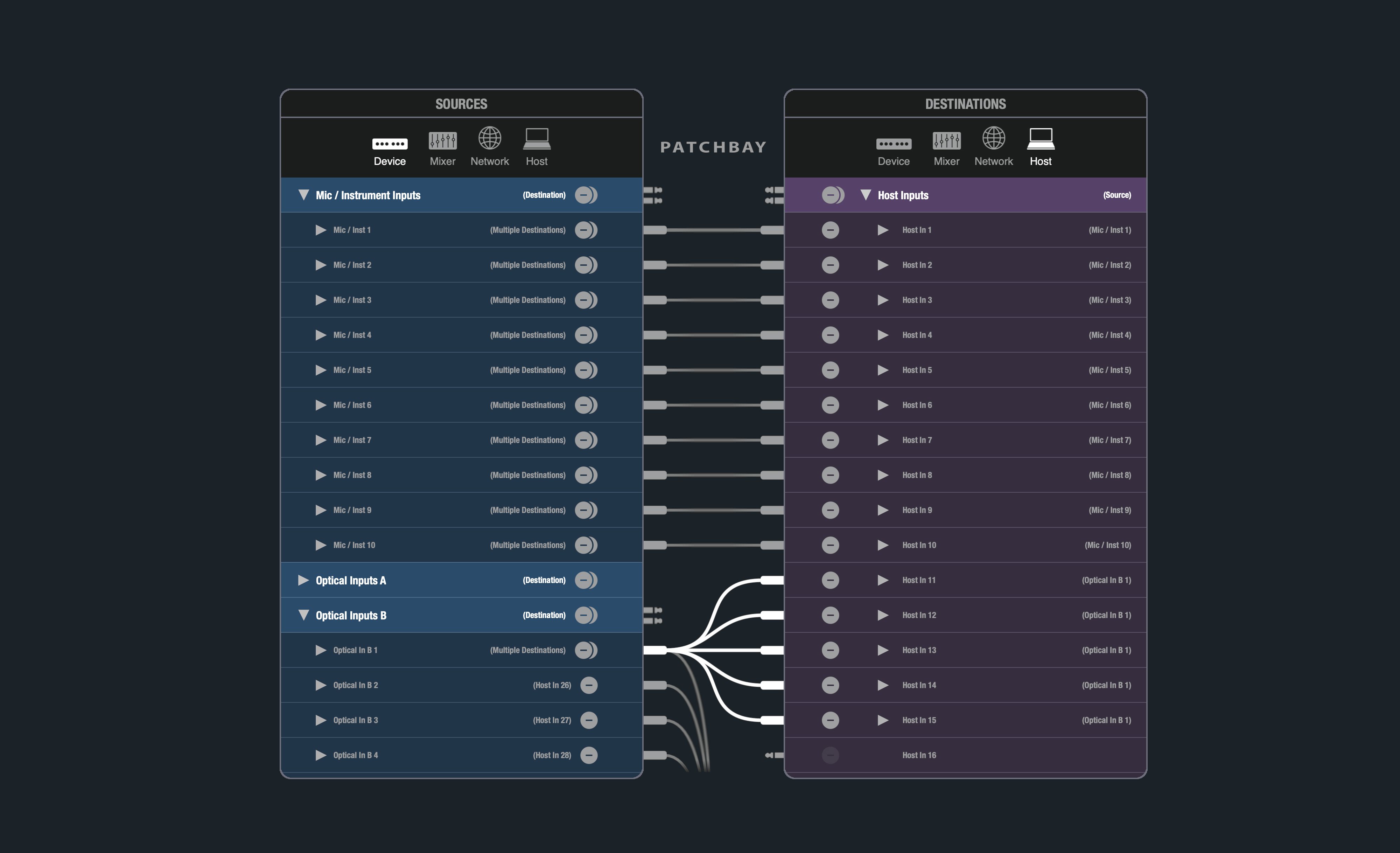 Sürükle-bırak arayüzüyle herhangi bir kaynak sinyali istediğiniz hedefe yönlendirebilirsiniz. Analog/dijital girişler, bilgisayar kanalları, mikser çıkışları veya ağ üzerindeki diğer cihazlar arasında esnek yönlendirme mümkündür. Tek bir kaynağı sınırsız sayıda çıkışa çoğaltabilirsiniz.