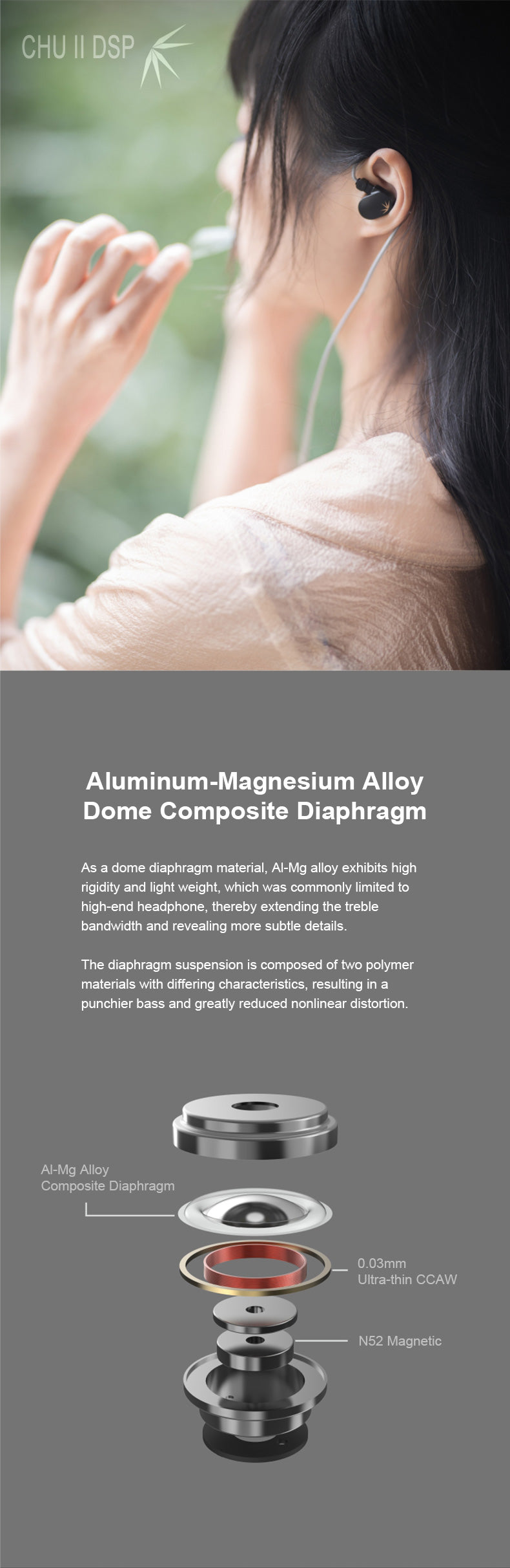 Moondrop Chu II DSP, 10 mm yüksek performanslı dinamik sürücüsü ile sizi devrim niteliğinde bir ses deneyimine davet ediyor. Alüminyum-Magnezyum Alaşımlı Kompozit Diyafram, olağanüstü netlik sunarak müziğinizi benzersiz detay ve hassasiyetle hayata geçirir.