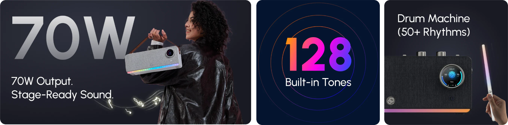 • Efektler ve Özellikler: 128 yüksek çözünürlüklü (high-fidelity) enstrüman sesi, Entegre Drum Machine ritimleri