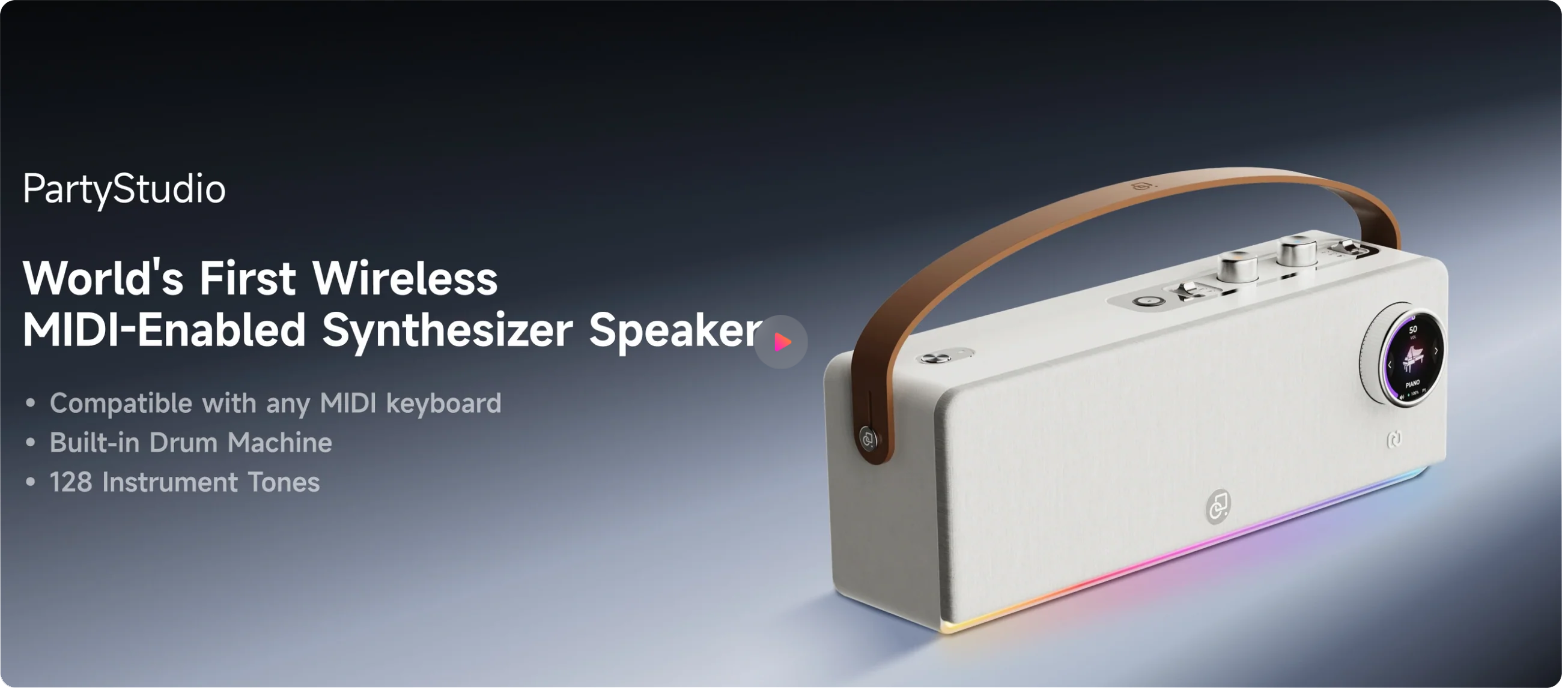 PartyStudio sıradan bir kablosuz hoparlörden fazlasıdır; MIDI klavyenizden aldığı verilerle gerçek enstrüman tonları üreten dahili bir ses çipine sahiptir. Bilgisayar gerektirmeyen bu mimari, gerçek zamanlı DSP sentezi (real-time DSP synthesis) ile donatılmıştır ve MIDI kontrolcünüzü saniyeler içinde tam teşekküllü (complete rig) bir enstrümana dönüştürür. Sistem; piyano, EP, gitar, synth'ler ve daha fazlasını içeren 128 adet dahili enstrüman tonu barındırır ve fiziksel bir kontrol tekerleği (dial) ile sesler arasında hızla geçiş yapmanızı sağlar. Ayrıca BPM kontrollü 50'den fazla dahili ritim barındıran entegre Drum Machine (davul makinesi) ile tek bir dokunuşla groove'u belirleyip tam bir grup formasyonunda (full band) performans sergileyebilirsiniz.